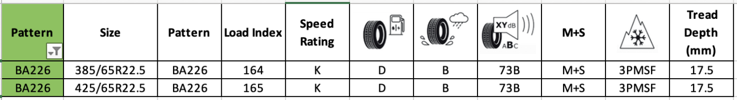 Trailer On&off BA226 is a high quality tire destined for installation on a semitrailer axle of a barrow pit dump trucks. Appropriate for the use in regional carriage. A tread's rubber blend has high wear properties. The tire is also resistant to cuts, damage.