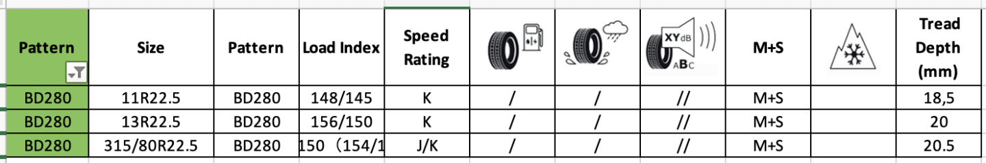 Drive On/off BD280 is a quality rubber destined for installation on a driving axle of dump trucks. It is designed for use on average distances on roads with mixed surfaces. The rubber has a long lifetime, an advanced durability and an excellent adhesion to the road as well as an increased passability.