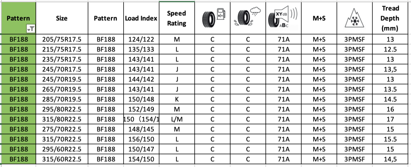 Steer Regional BF188 tires are destined for steering/trailer axle. These are designed for driving vehicles on the highways. The components of a rubber blend ensure high durability and a long lifetime.