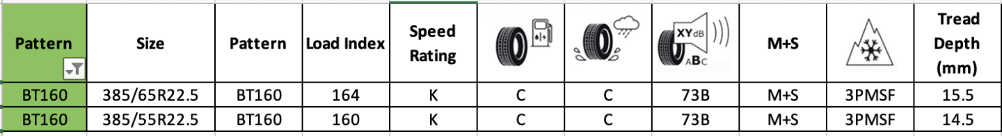 Steer Regional BT160 is a firm tire destined for installation on a driving axle or a trailer. It is suitable not only for regional, but also for highway carriage. Wide longitudinal sipes ensure an effective water removal, prevent slippage. An optimised tread pattern has a reduced noisiness, what ensures a comfort during the driving. Enhanced shoulder area lowers an effect of an uneven wear.