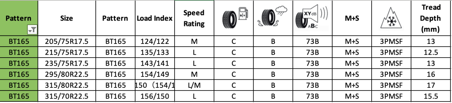 Steer Regional BT165 are quality and firm tires destined for driving on regional roads and highways. The tires are characterised by high durability, long working lifespan, and an excellent combination of cost and quality. The tires have good indicators of fuel consumption and are designed for use on lorries, buses, dump trucks, and dustcarts.