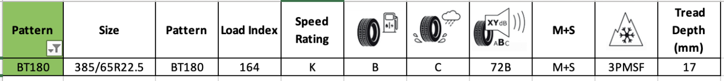 Trailer Regional BT180 is a tire destined for installation on a trailer axle. It is used for regional and international carriage. A deep tread pattern ensures a lasting lifetime. It is suitable for operation on any road surfaces.