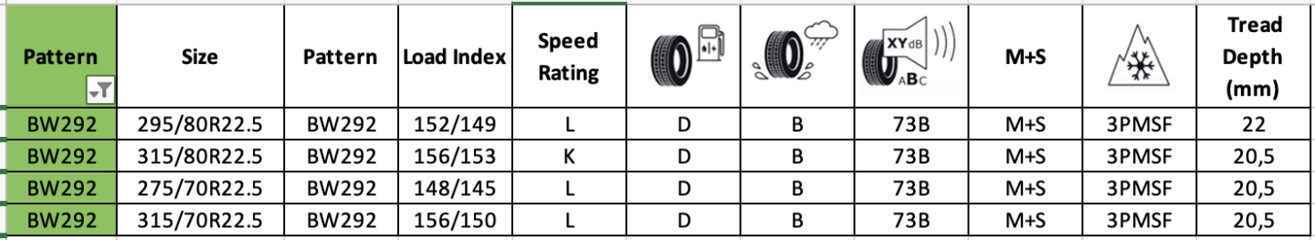 Drive Winter BW292 is a model designed for an operation in difficult winter conditions, ensures a better adhesion and breakage than universal tires and is recommended for the installation on a driving axle.